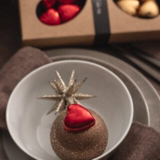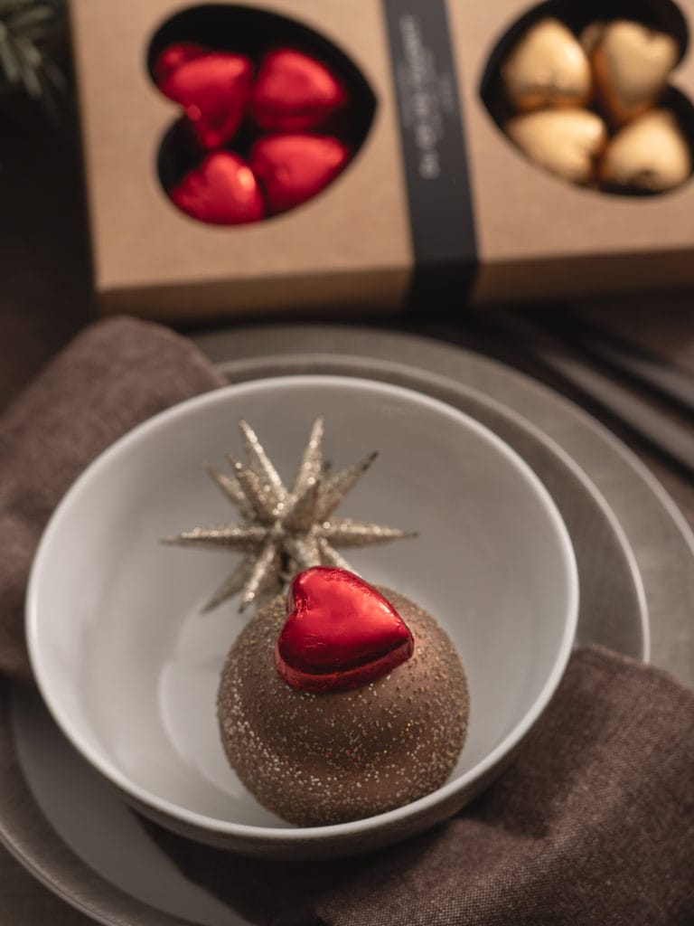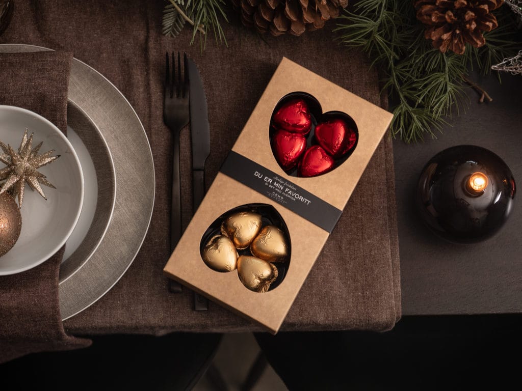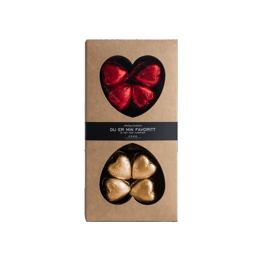 Røde hjerter: Sukker, kakaomasse, helmelkspulver, smørolje (melk), kakaosmør, sorbitolsirup, helmelk, fuktighetsbevarende middel (glyserol), glukosesirup, laktose, vann, emulgator (soyalecitin), vaniljearoma. Kan inneholde spor av gluten, egg og nøtter. Nettovekt: ca. 100 g