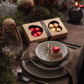 Sølvhjerter: Sukker, invertsukkersirup, helmelkspulver, kakaosmør, smørolje (melk), kakaomasse, laktose, glukosesirup, karamellisert sukker, helmelk, vann, vaniljearoma, emulgator (soyalecitin), vaniljeekstrakt. Kan inneholde spor av gluten, egg og nøtter. Nettovekt: ca. 100 g