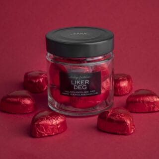 Liker deg: Sukker, kakaomasse, helmelkspulver, smørolje (melk), kakaosmør, sorbitolsirup, helmelk, fuktighetsbevarende middel (glyserol), glukosesirup, laktose, vann, emulgator (soyalecitin), vaniljearoma. Kan inneholde spor av gluten, egg og nøtter. Nettovekt: 100 g