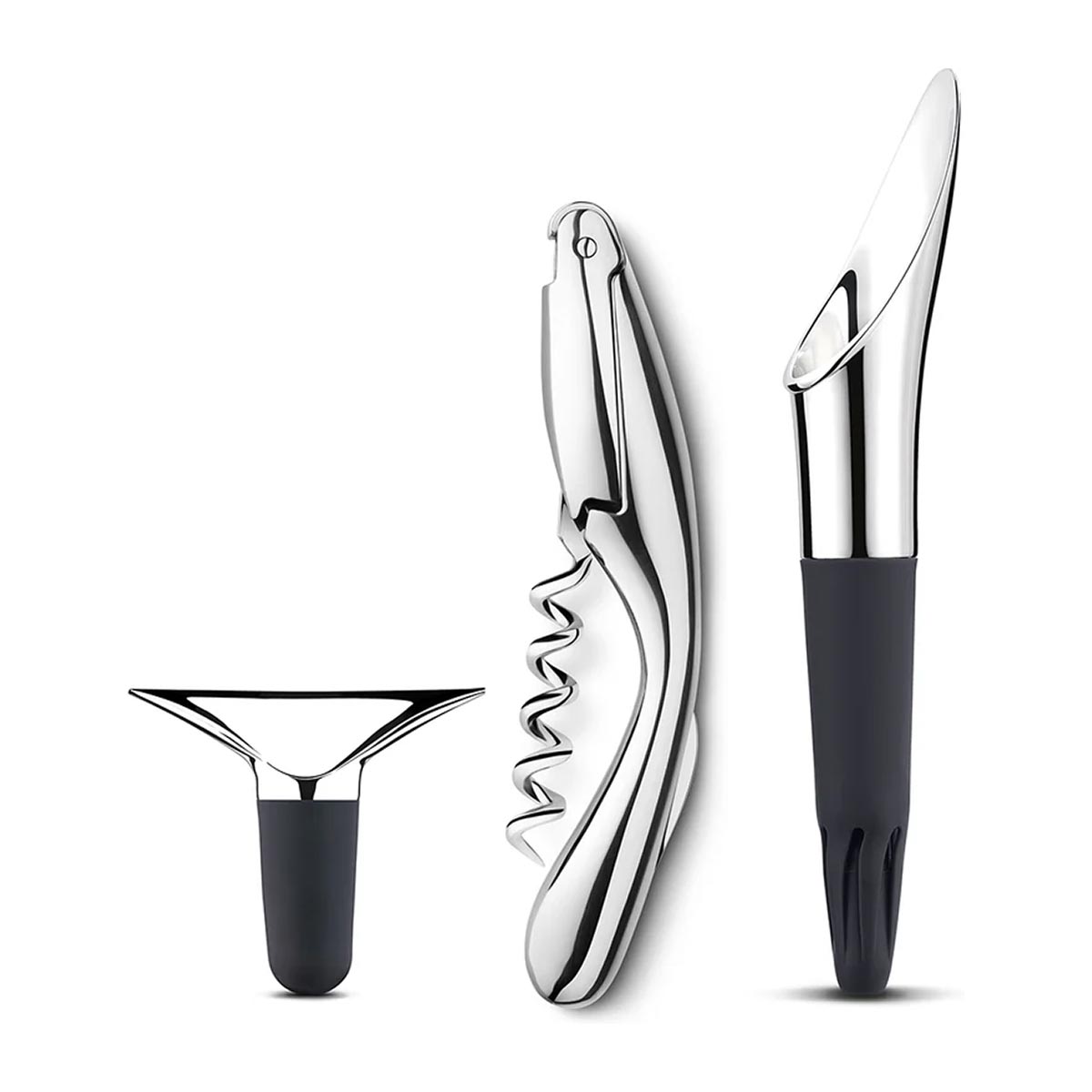 I dette elegante settet fra Georg Jensens Wine & Bar- kolleksjon får du vinkork, skjenketut og korketrekker. Vinkorken er designet så den passer perfekt til vinflasker og karafler. Skjenketuten er utviklet med et unikt OxiPour™-system som lufter vinen optimalt slik at du får den beste smaksopplevelsen. Korketrekkeren er laget blankt rustfritt stål og har en ergonomisk utforming.