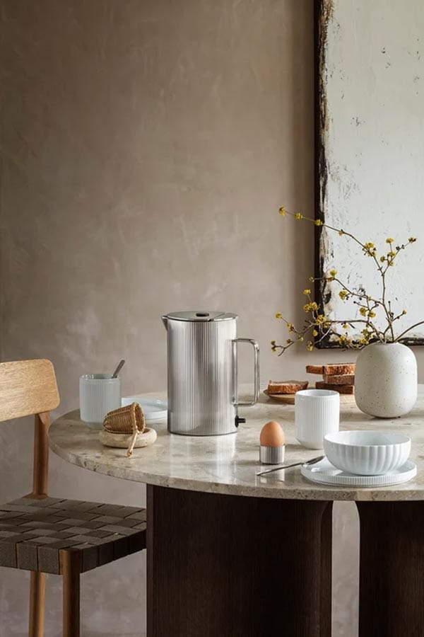 Vakre Bernadotte vannkoker i rustfritt stål forener elegant design med funksjonalitet for å skape uunnværlig kjøkkenutstyr som skiller seg ut. Den ikoniske, rillede designen fra den populære Bernadotte-kolleksjonen er bevart i vannkokerens design og gir den et elegant uttrykk. Vannkokeren er designet for daglig bruk og rommer opptil 1,5 liter. Den har en separat sokkel som gjør det enkelt å håndtere vannkokeren. En automatisk stoppfunksjon aktiveres når vannet når kokepunktet, og vannkokeren har dobbel vegg og holder dermed godt på varmen.