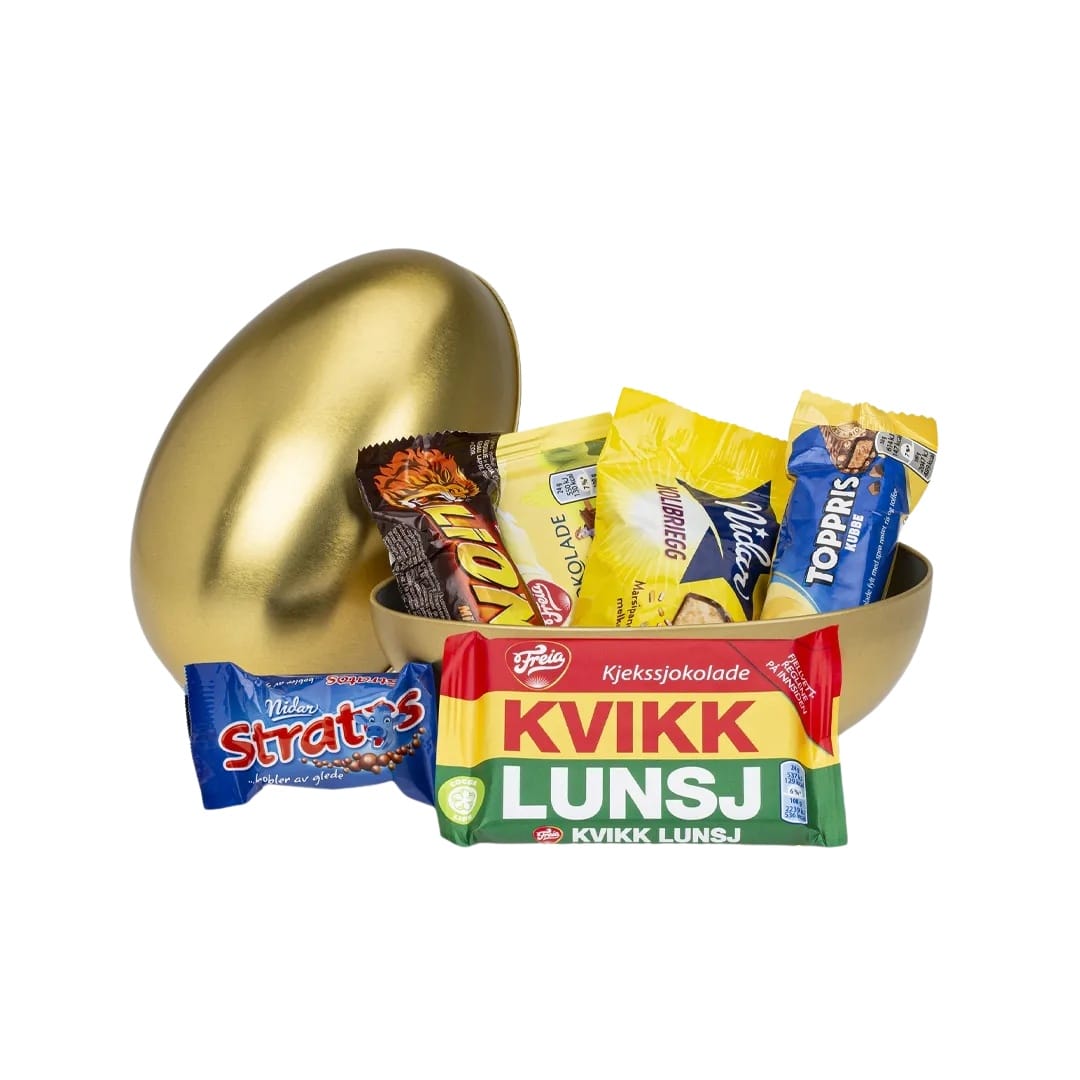 Gi dine ansatte eller kunder en smak av påske nmed vår eksklusive Gullegg 15 cm med påskeklassikere! Med de deilige favorittene Kvikk Lunsj, Melkesjokolade, Kolibri Marsipanegg, Lion bit, Stratos Mini og Toppris, er denne gaven garantert å spre glede og takknemlighet.