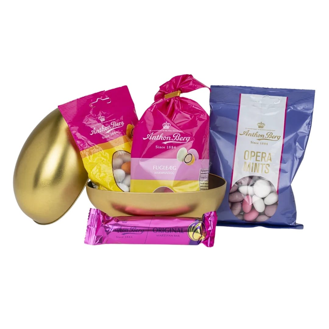 Innhold: Anthon Berg Opera Mints 140g, Anthon Berg Fugleegg / Marsipanegg Påske 80g, Anthon Berg Mandelegg 80g pose Påske 80g, Anthon Berg Marsipanbrød 25g.