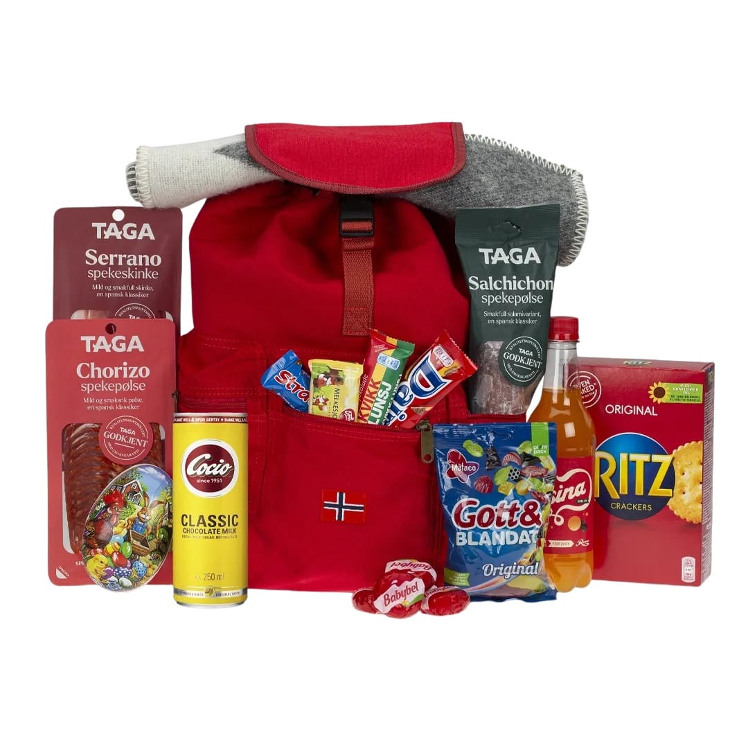 Innhold: Olasekk med norsk flagg rød, Sitteunderlag, Asina Appelsin brus, Cocio 250ml, Serranoskinke skivet 55g, Taga Chorizo spekepølse 70g, Ritz kjeks 200g, Taga Salchicon spekepølse , Baby Bell Mini Ost 120g, Påskeegg 12 cm Norske klassikere 160g.