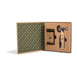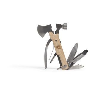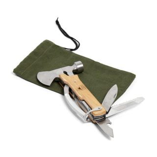 Multiverktøy med tang, avbiter, liten øks, kniver, neglfil, meisel og flaskeåpner. Leveres i en fin canvaspose og gaveeske. Lengde: 15 cm.