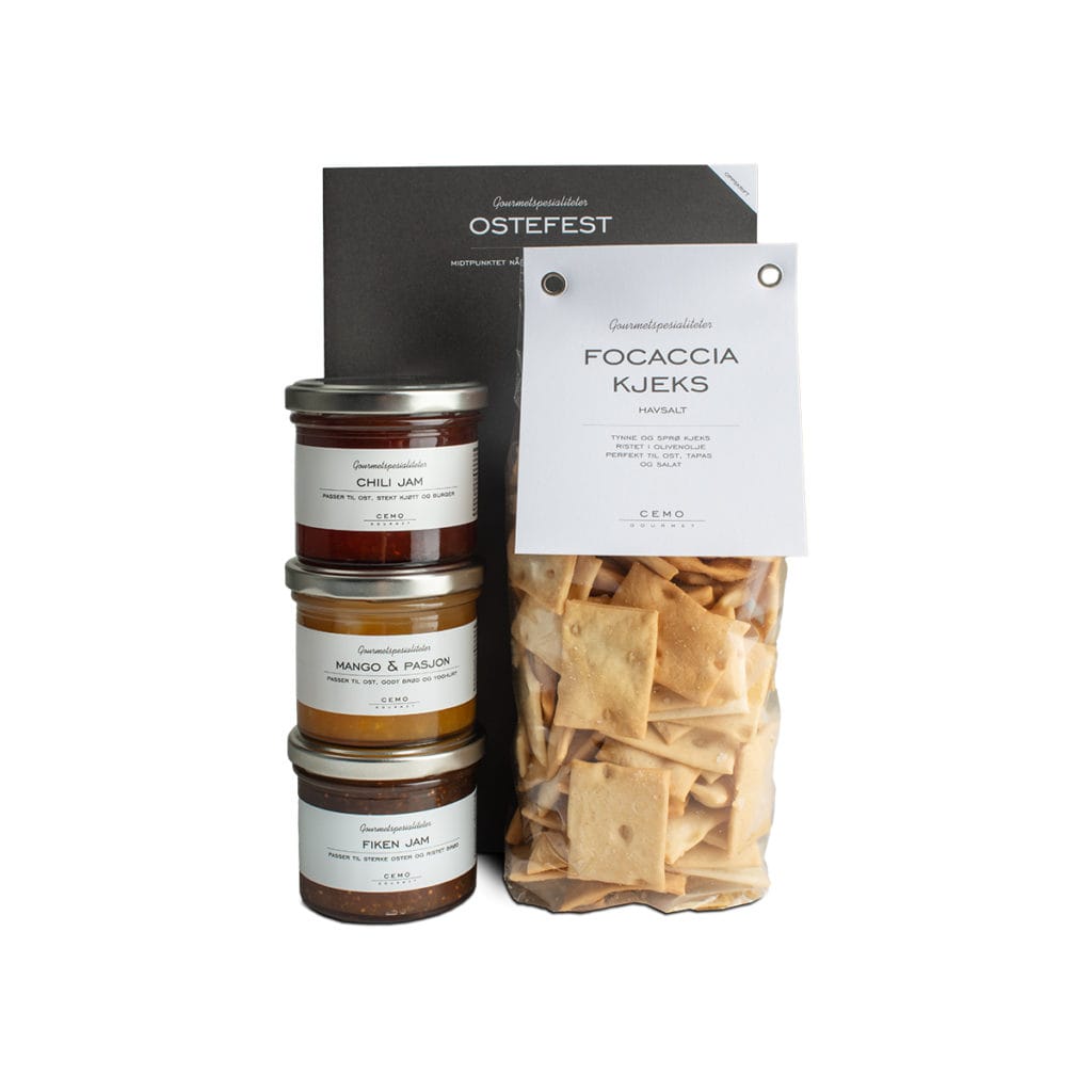 Chili jam: Sukker, rødløk, paprika, eddik, chili, hvitløk, ingefær, pektin, surhetsregulerende middel (sitronsyre), konserveringsmiddel (kaliumsorbat og natriumbenzoat). Nettovekt: 113 g