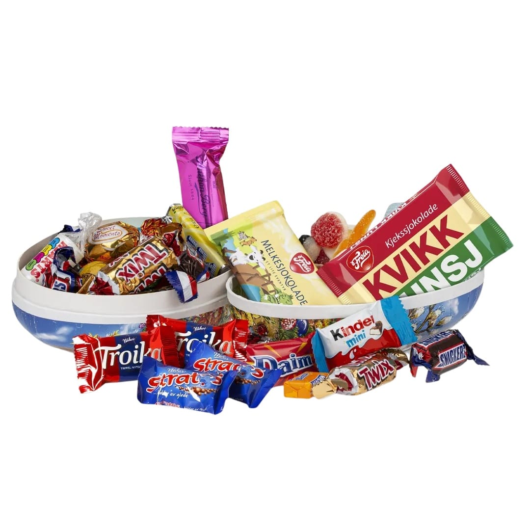 Innhold: Smågodt 200g, Innpakkede biter Classic 100g, Kvikk Lunsj 47g, Eventyr Melk 24g, Anthon Berg Marsipanbrød 25g. Innholdet pakkes i tette resirkulerbare porsjonsposer.