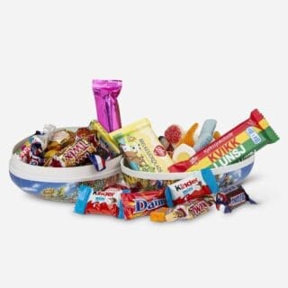 Innhold: Godt & Blandet 50g, Eventyr Melkesjokolade 24g, Kvikk Lunsj 47g, Anthon Berg Mandelegg 80g, Kolibri Marsipanegg 58g, Stratos bit 10g, Troika bit 12g, Lion bit 16g, Squashies Drumstick 60g.