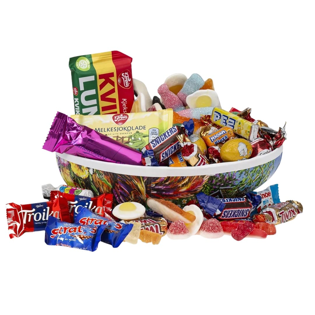 Innhold: Smågodt 600g, Innpakkede biter Classic 150g , Kvikk Lunsj 47g, Eventyr Melkesjokolade 24g, Anthon Berg Marsipanbrød 25g. Innholdet pakkes i tette resirkulerbare porsjonsposer.