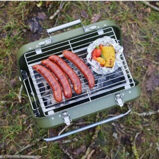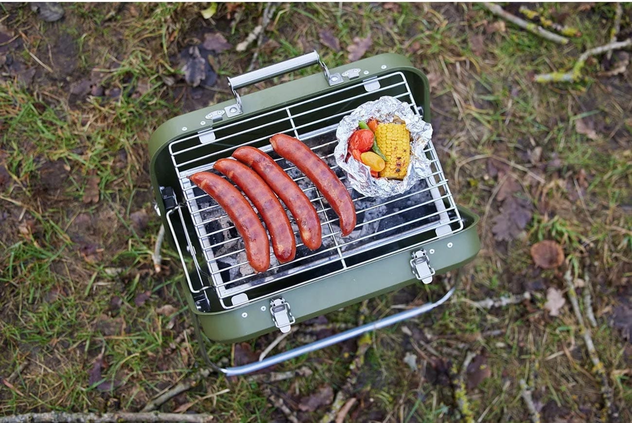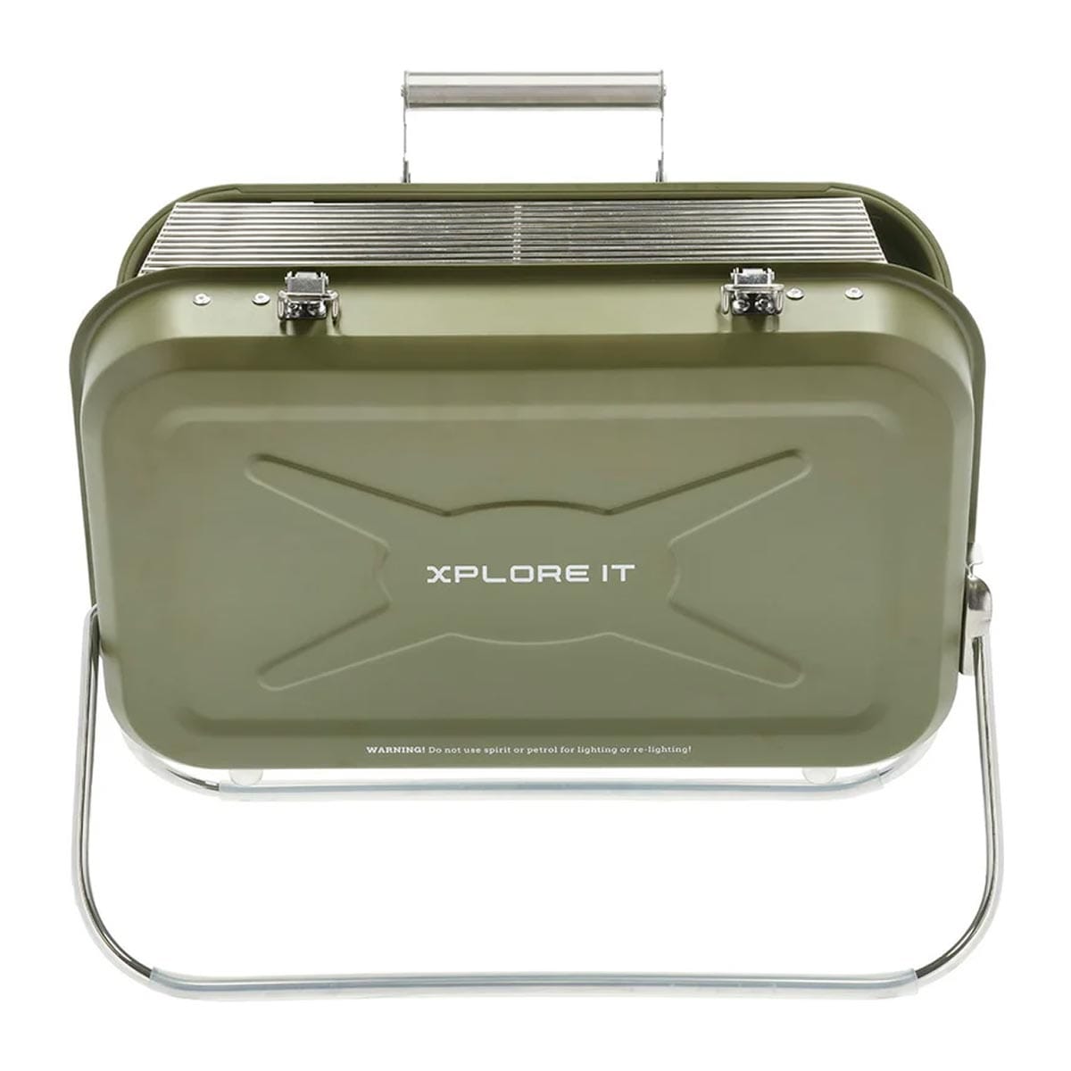 Praktisk koffertgrill med grillrist, kullrist og dryppbrett. 40 x 31,5 x 32 cm. Rustfritt stål, army.