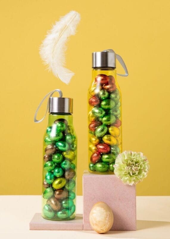 Godtebottle fylt med ca. 300 g deilig smågodt. Et moderne påskeegg for dem som elsker godteri til påske, men som også er miljøbevisste og ønsker en forpakning som kan brukes om og om igjen. Flasken uten godteri kan f.eks. brukes til oppbevaring av vann, saft og jus og brukes på tur, trening, jobb og mange andre steder.